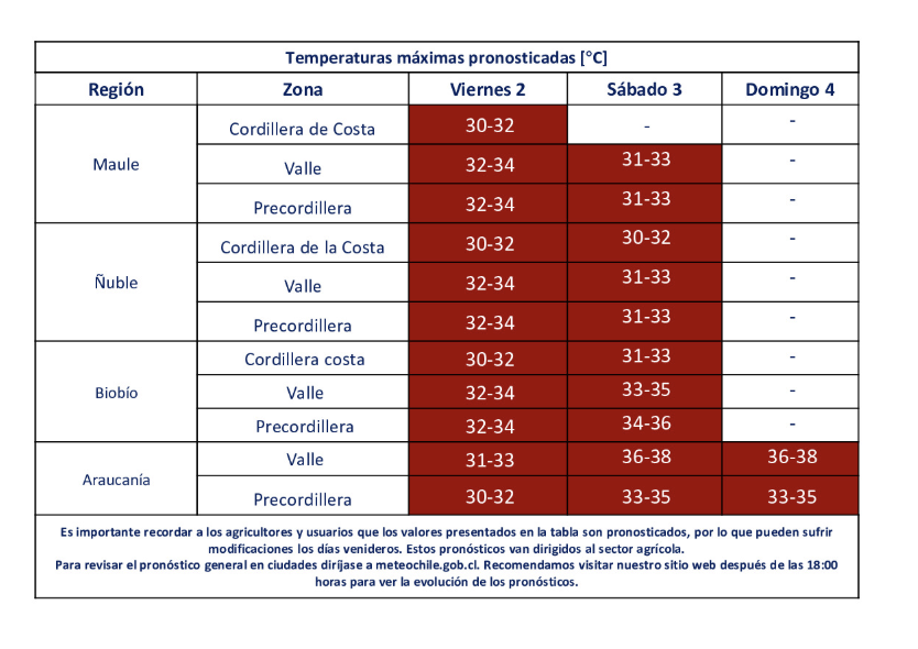 De acuerdo con el pronóstico, en el Valle y Precordillera del Maule y Biobío se esperan rangos entre 32 y 36 °C, mientras que en Ñuble los registros podrían situarse entre 31 y 34 °C, dependiendo del sector.