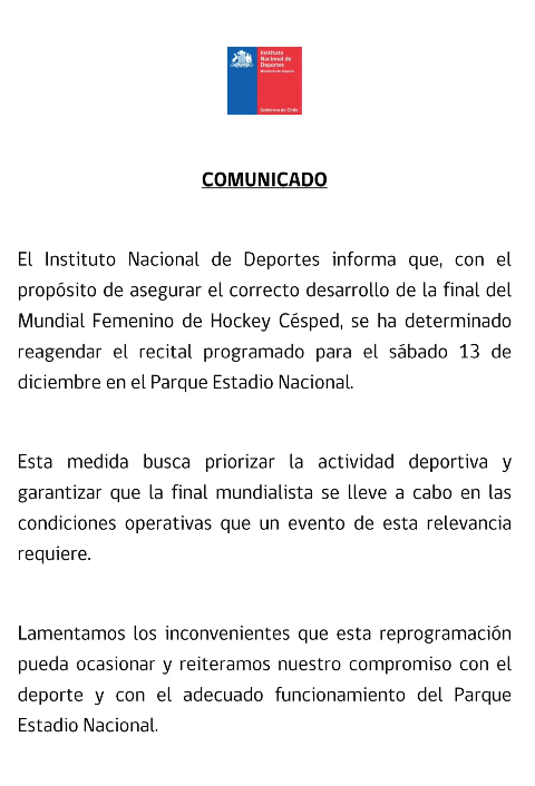 “Con el propósito de asegurar el correcto desarrollo de la final del Mundial Femenino de Hockey Césped, se ha determinado reagendar el recital programado para el sábado 13 de diciembre en el Parque Estadio Nacional”.